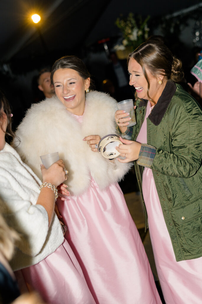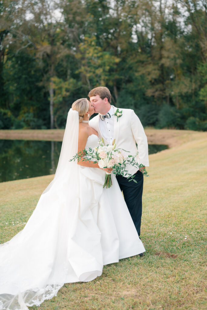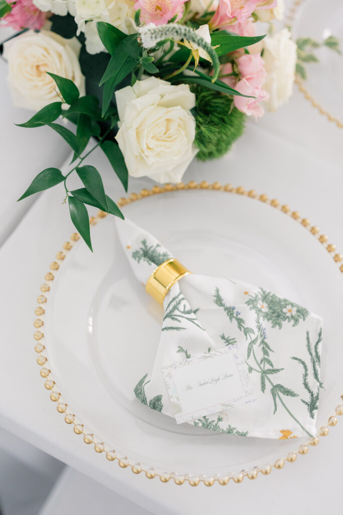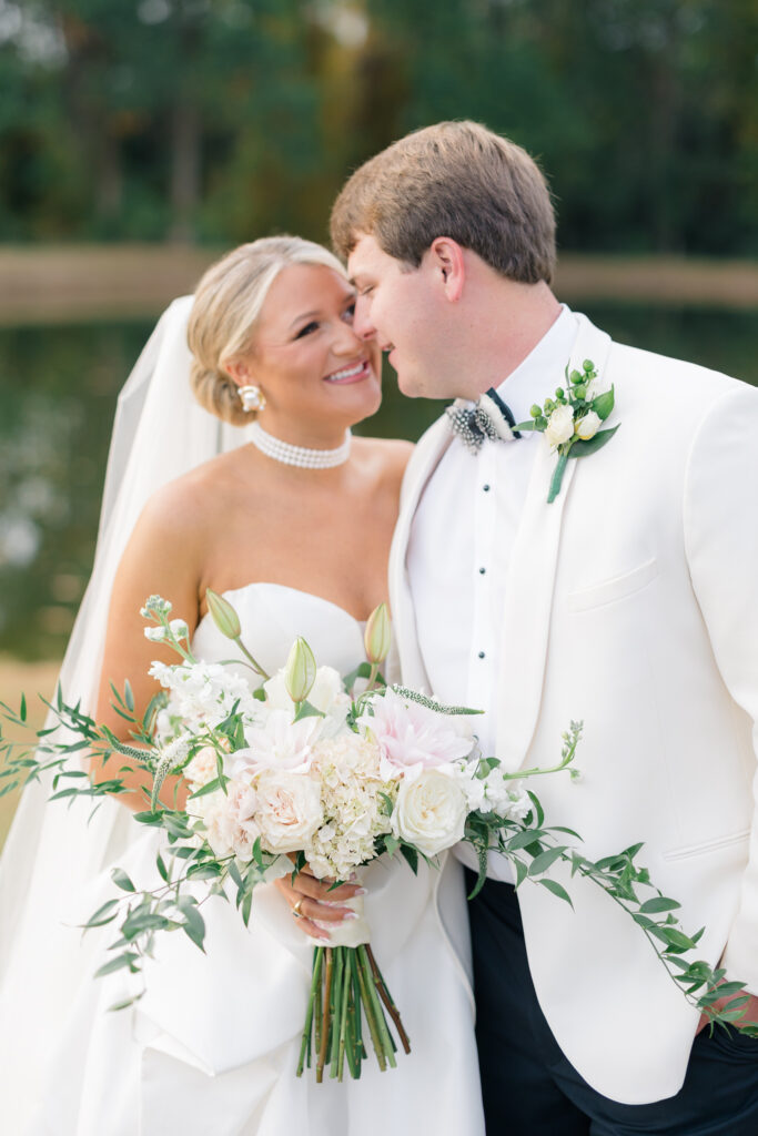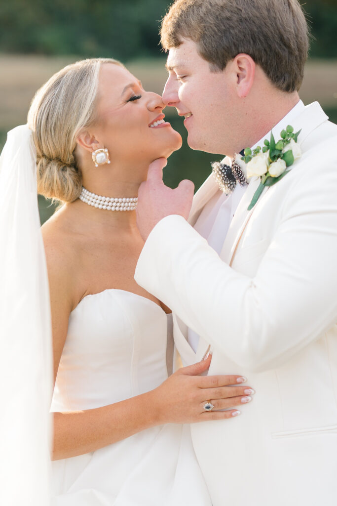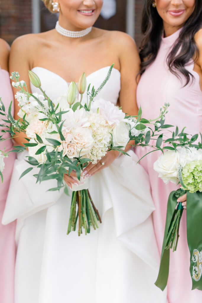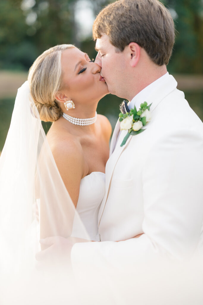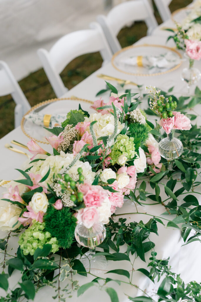 The tent was draped in soft white linens and filled with lush greenery and pastel pink florals that reflected Amber’s romantic vision. As the sun began to set, the golden light filtered through the tent, creating the dreamiest glow for portraits. It was the kind of setting that feels like it was designed for light and airy, true-to-color wedding photography— bright, timeless, and effortlessly elegant.