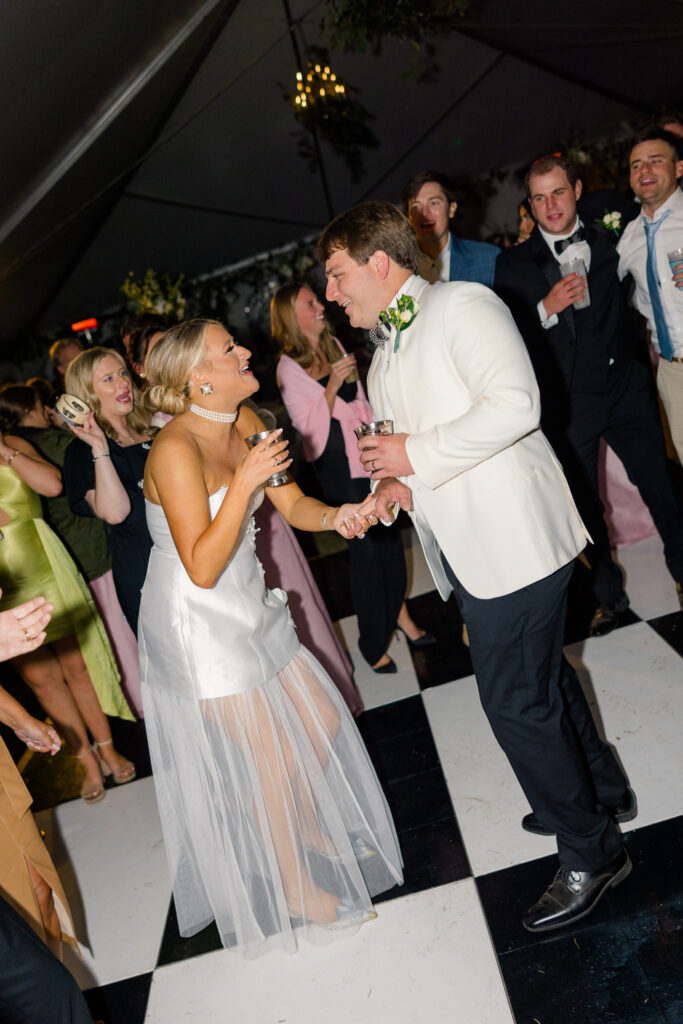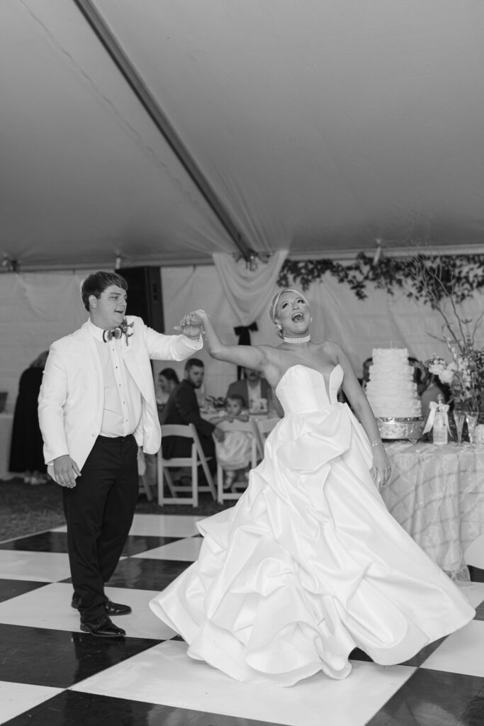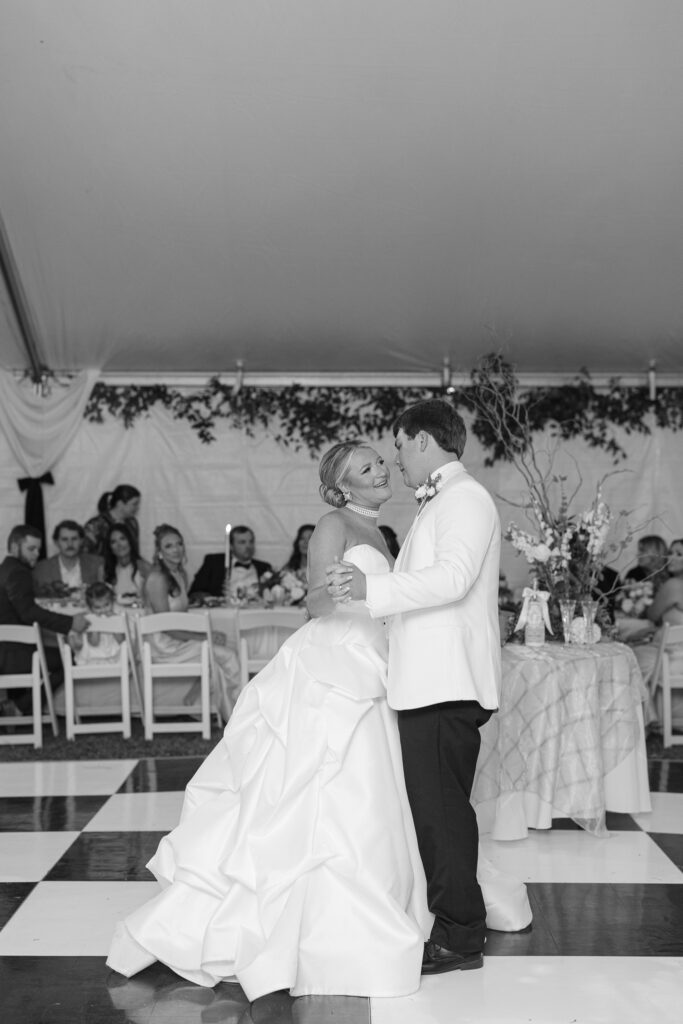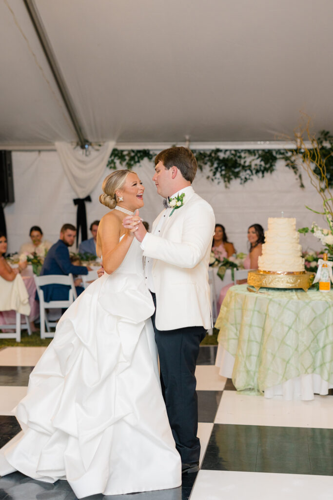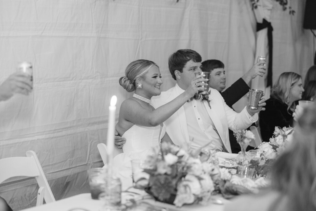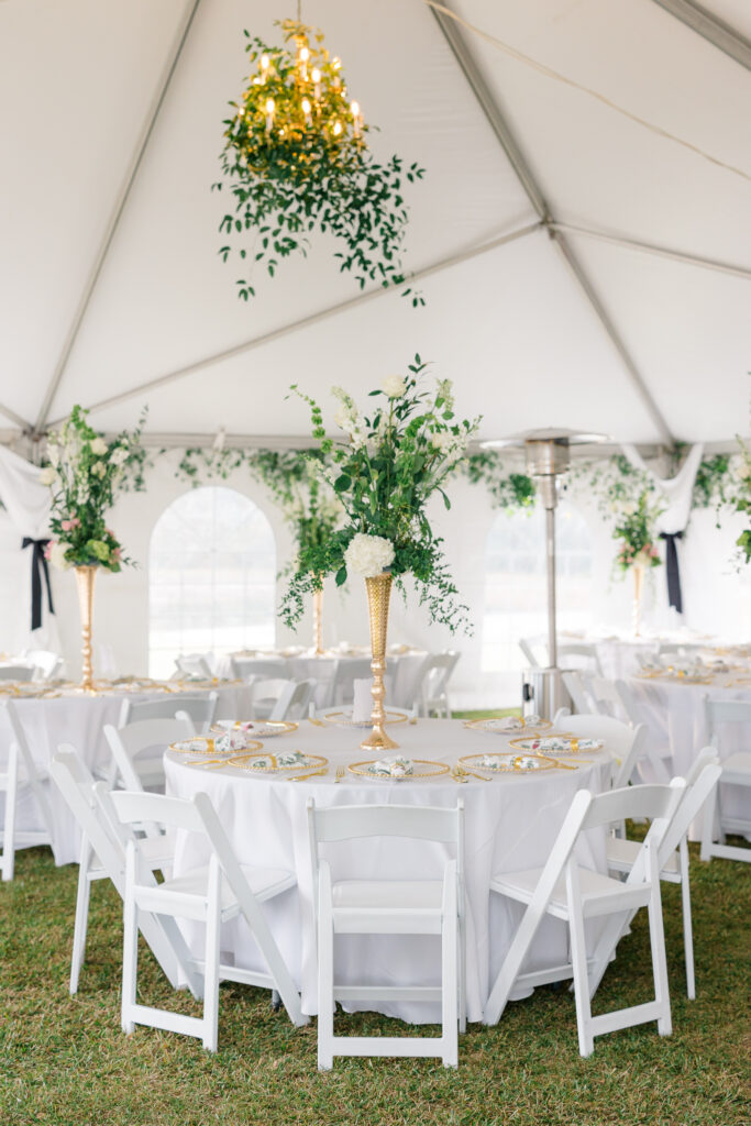 After the ceremony, guests made their way to family property, where an elegant tented reception awaited. Hosting their celebration at home made the day even more personal. Every corner of the property held memories — from childhood afternoons spent in the backyard to family gatherings under the same oak trees that now framed their wedding day.