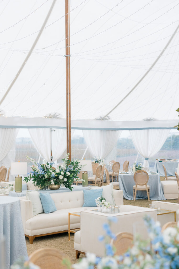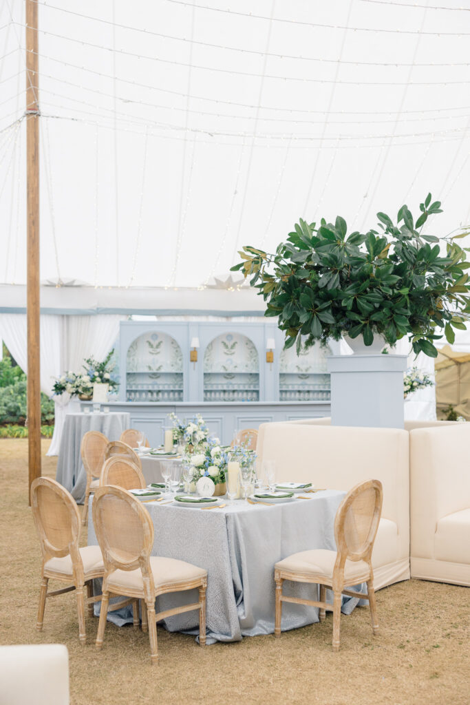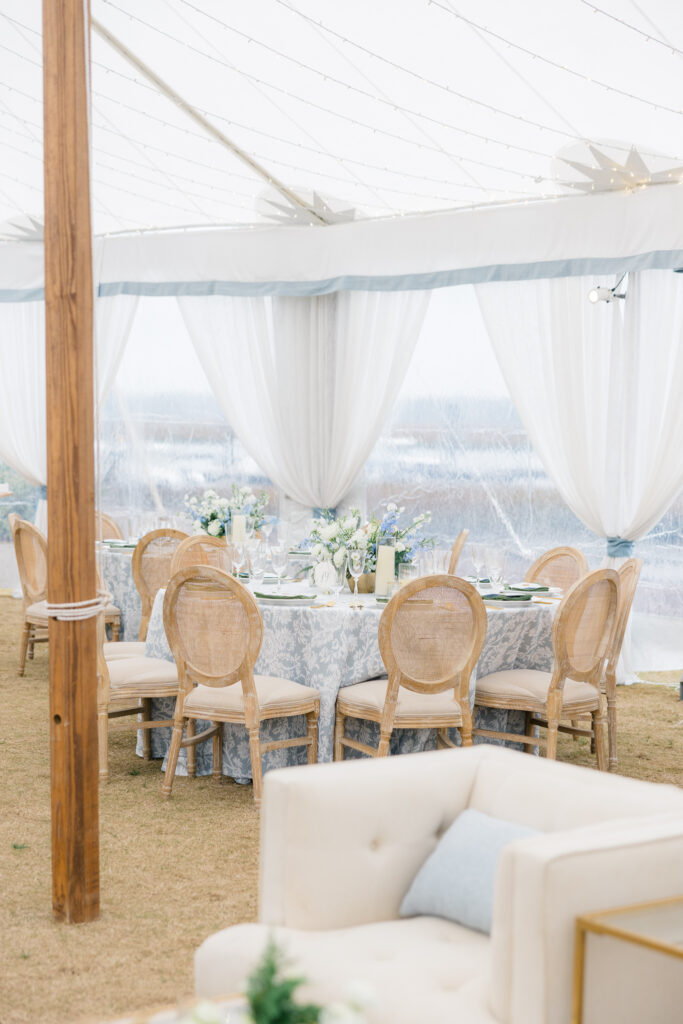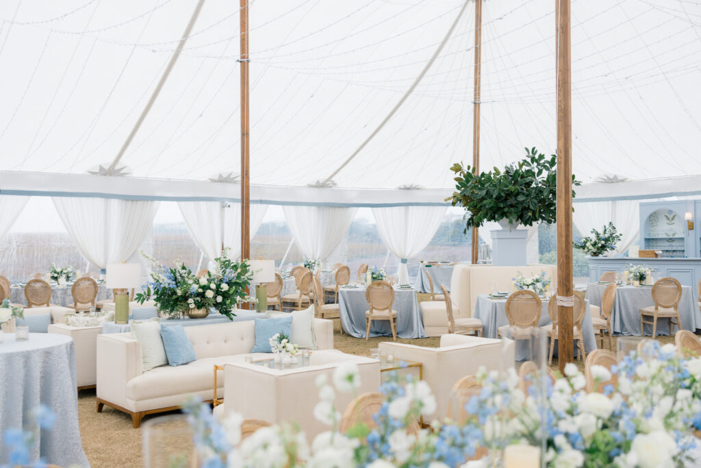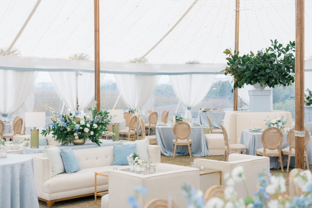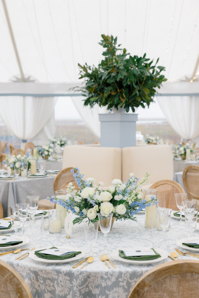 The reception design was everything a Figure Eight Island wedding should be—elevated, inviting, and thoughtfully curated. Guests enjoyed soft seating areas, candlelit tables, winter cocktails, and the calm sound of the water just beyond the tent. The palette of dusty blues and greens paired beautifully with the December backdrop of Christmas trees on the stage behind the band, creating a timeless coastal winter aesthetic.
