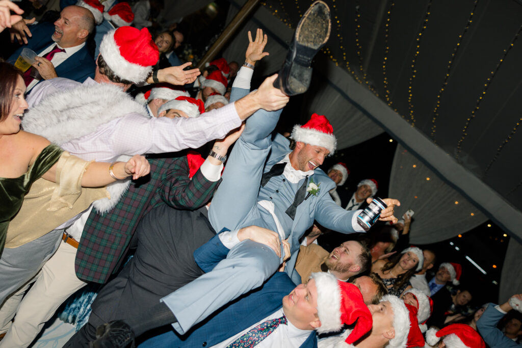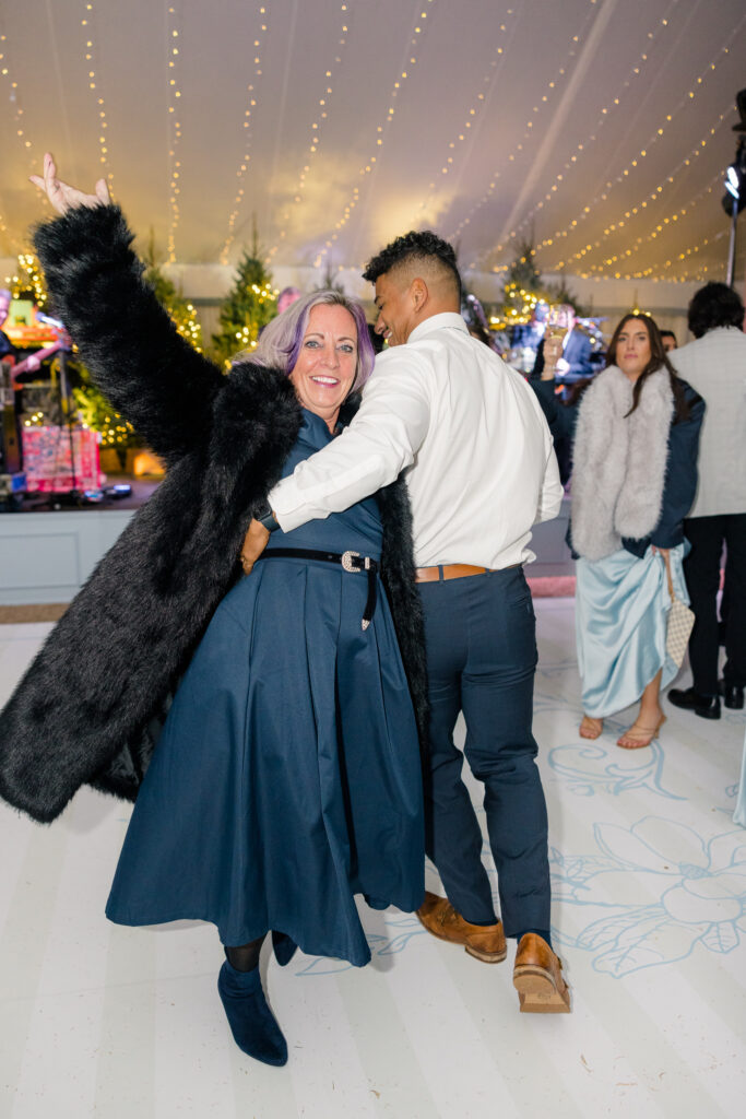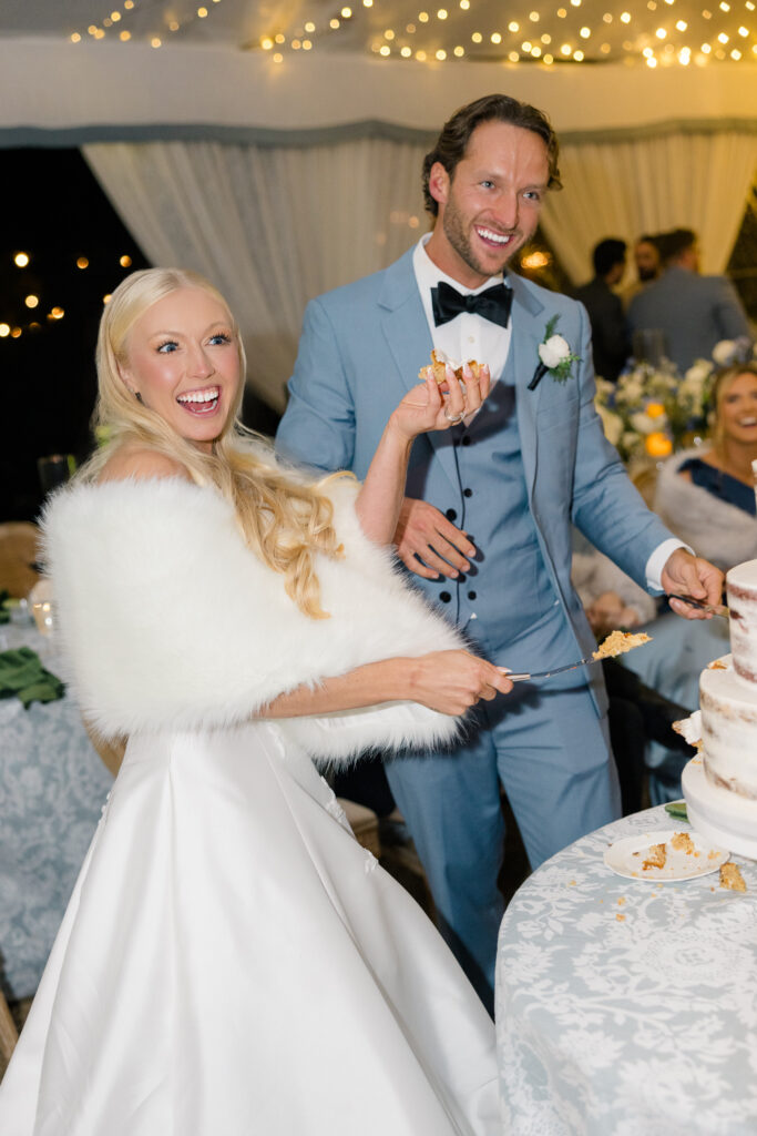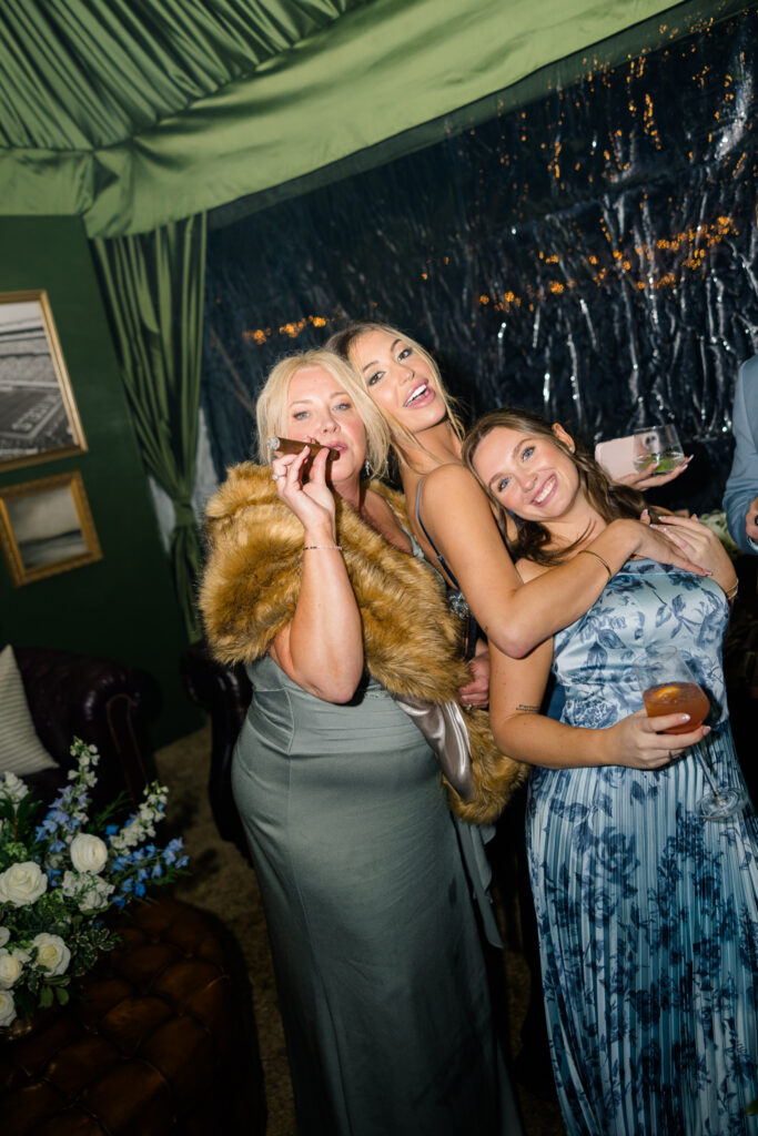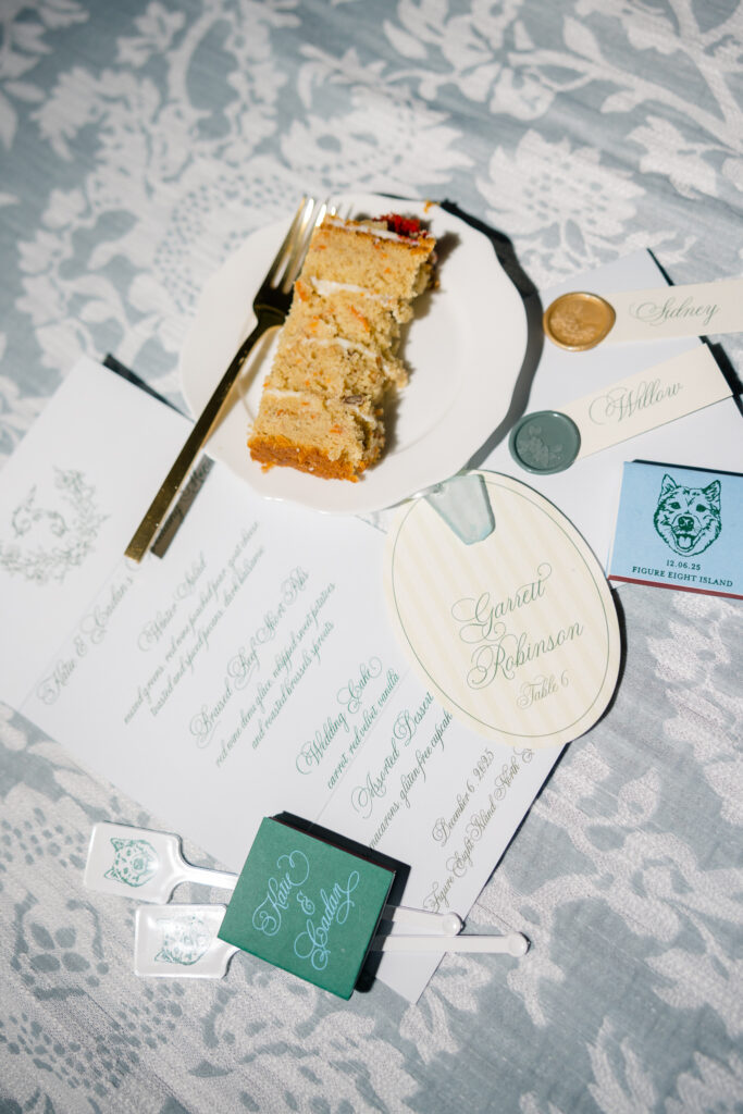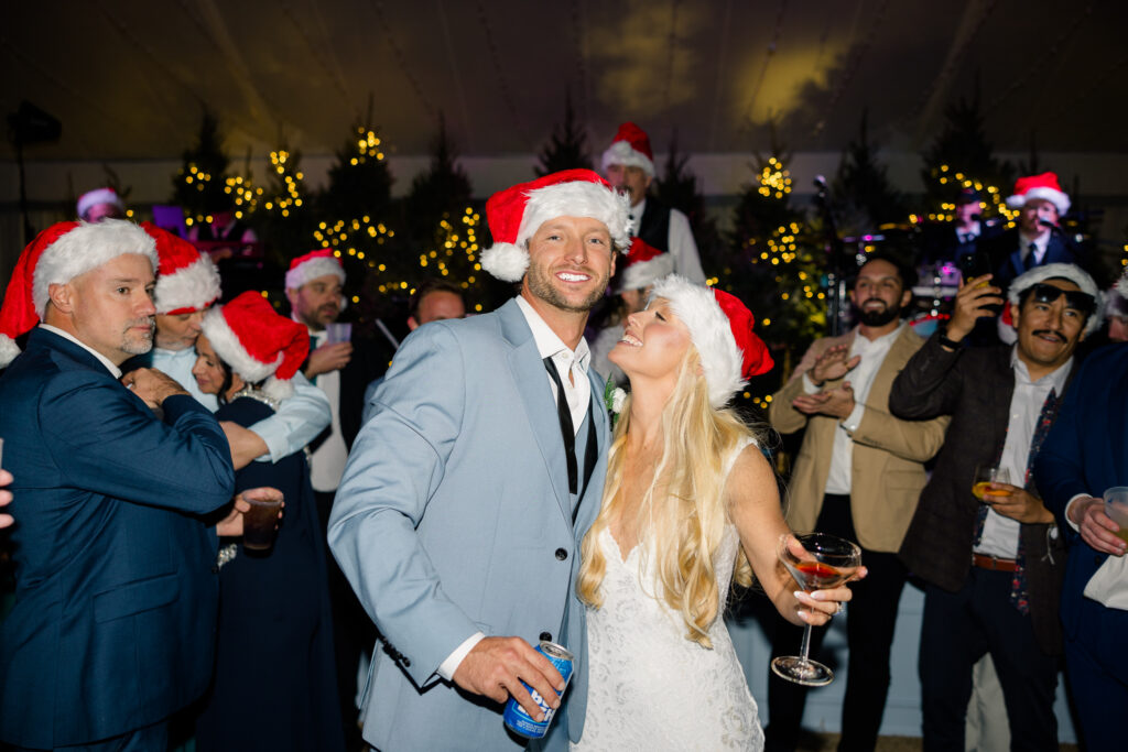 The reception design was everything a Figure Eight Island wedding should be—elevated, inviting, and thoughtfully curated. Guests enjoyed soft seating areas, candlelit tables, winter cocktails, and the calm sound of the water just beyond the tent. The palette of dusty blues and greens paired beautifully with the December backdrop of Christmas trees on the stage behind the band, creating a timeless coastal winter aesthetic.