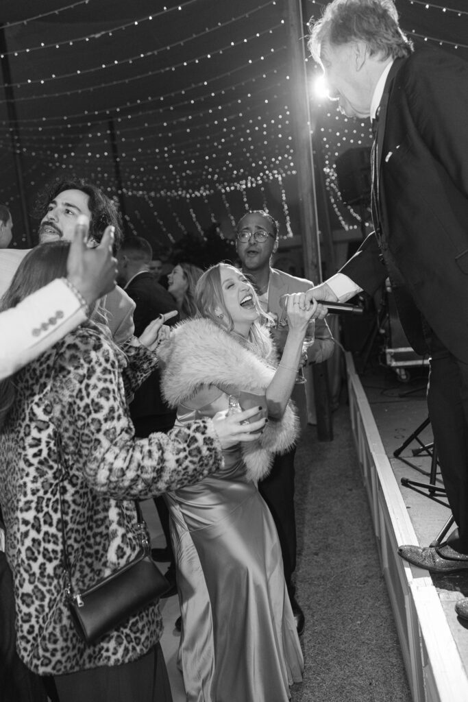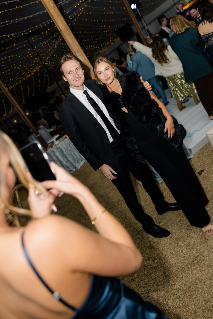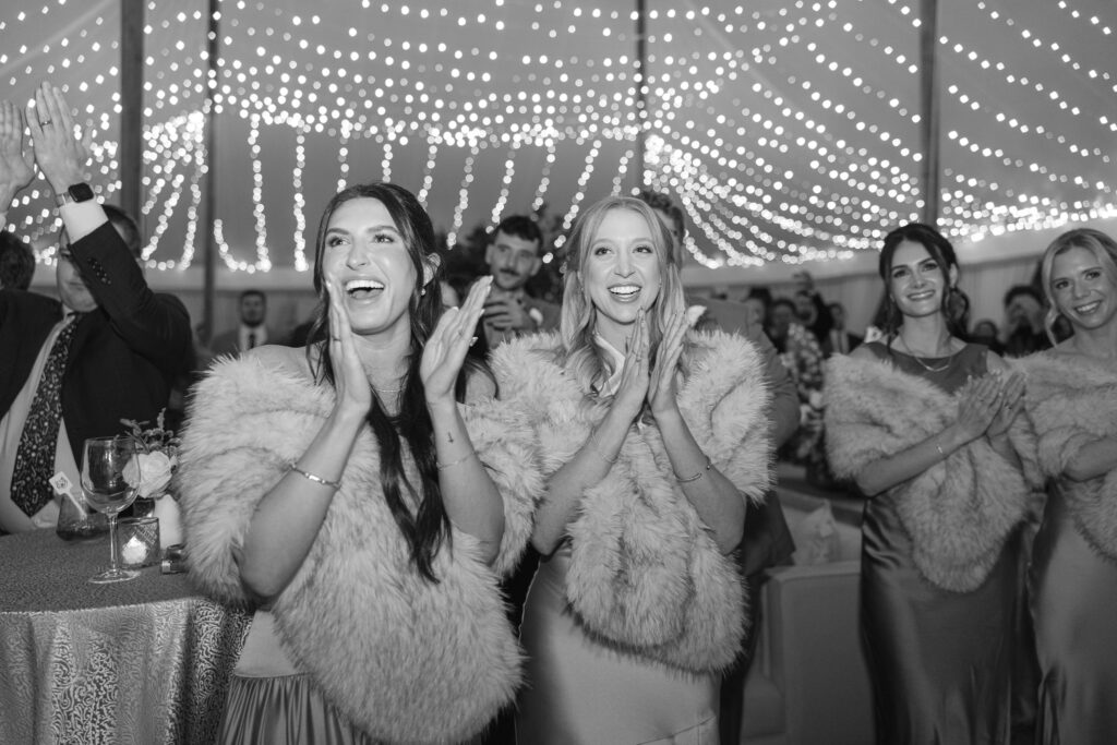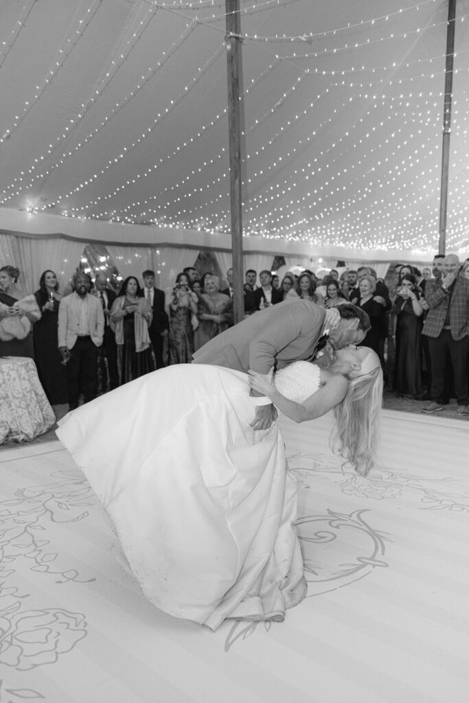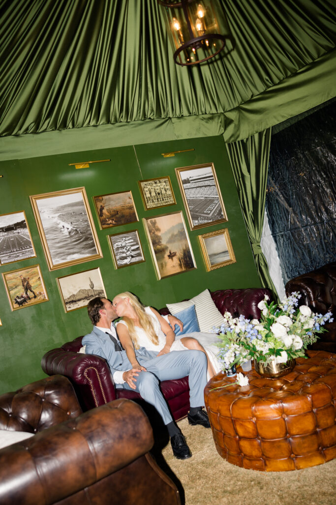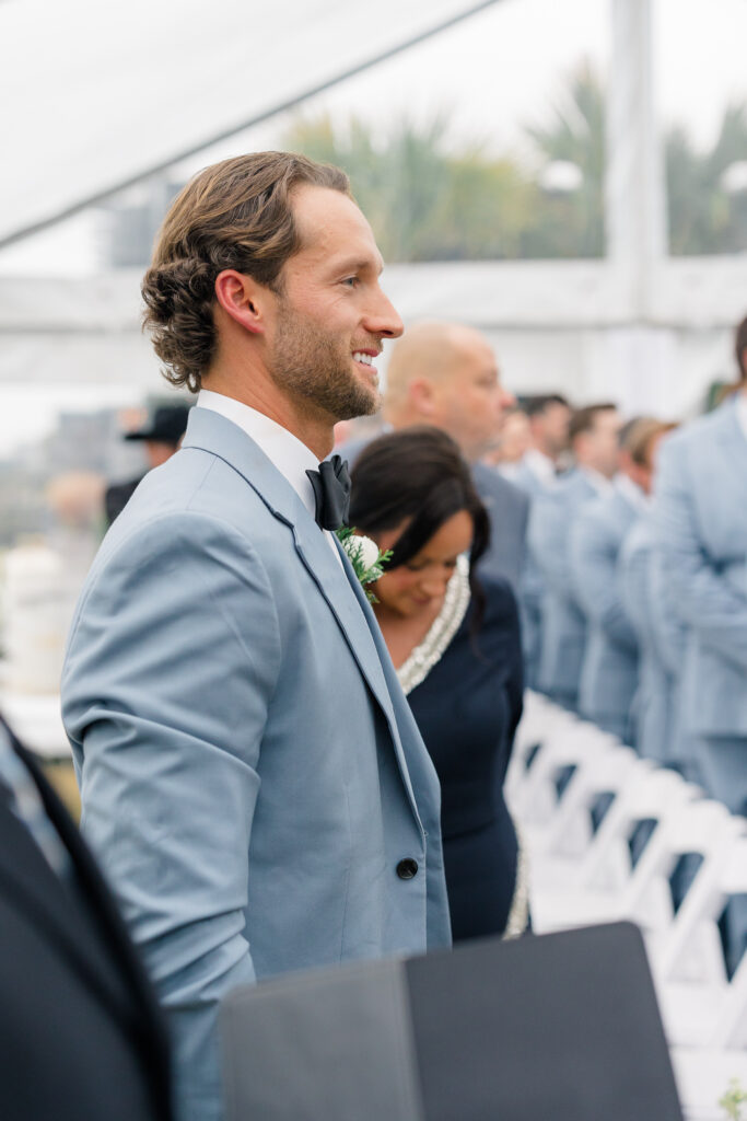 The reception design was everything a Figure Eight Island wedding should be—elevated, inviting, and thoughtfully curated. Guests enjoyed soft seating areas, candlelit tables, winter cocktails, and the calm sound of the water just beyond the tent. The palette of dusty blues and greens paired beautifully with the December backdrop of Christmas trees on the stage behind the band, creating a timeless coastal winter aesthetic.