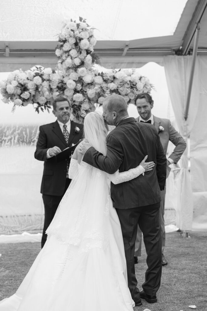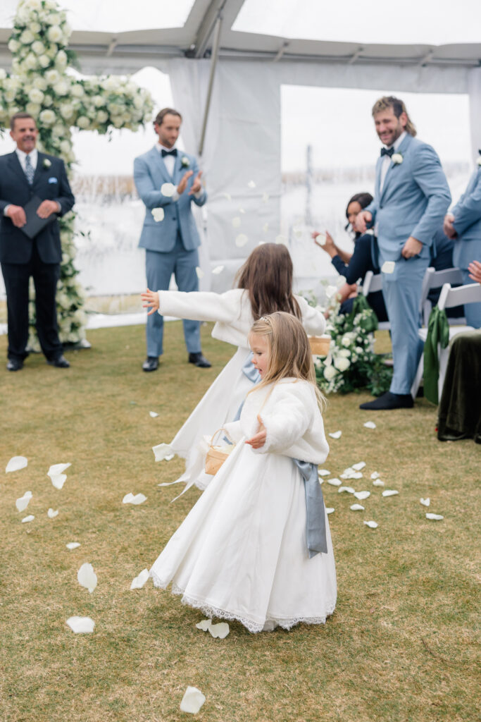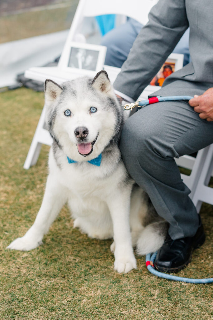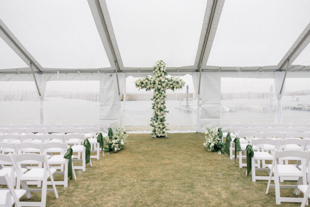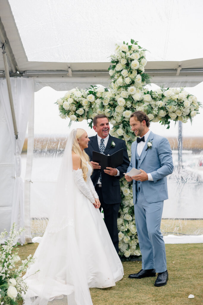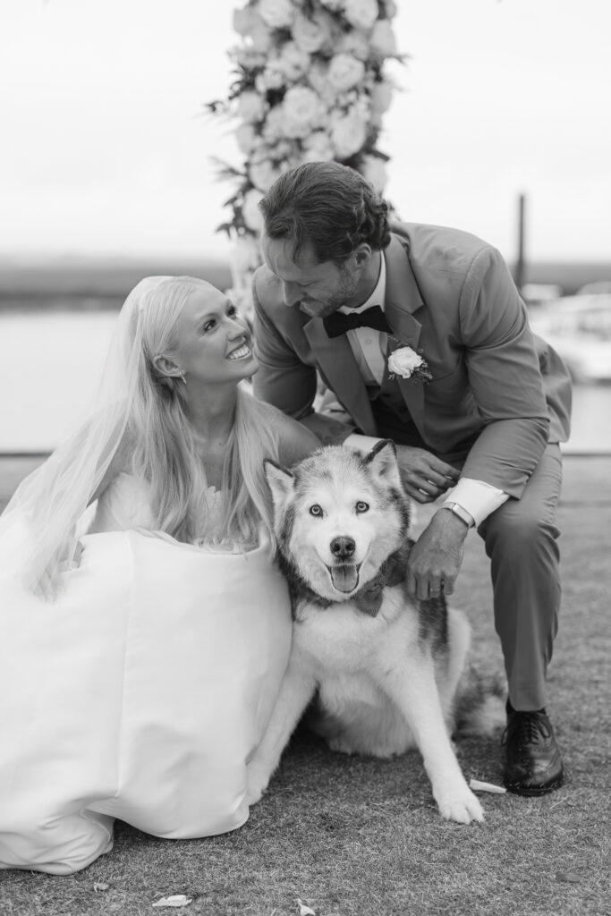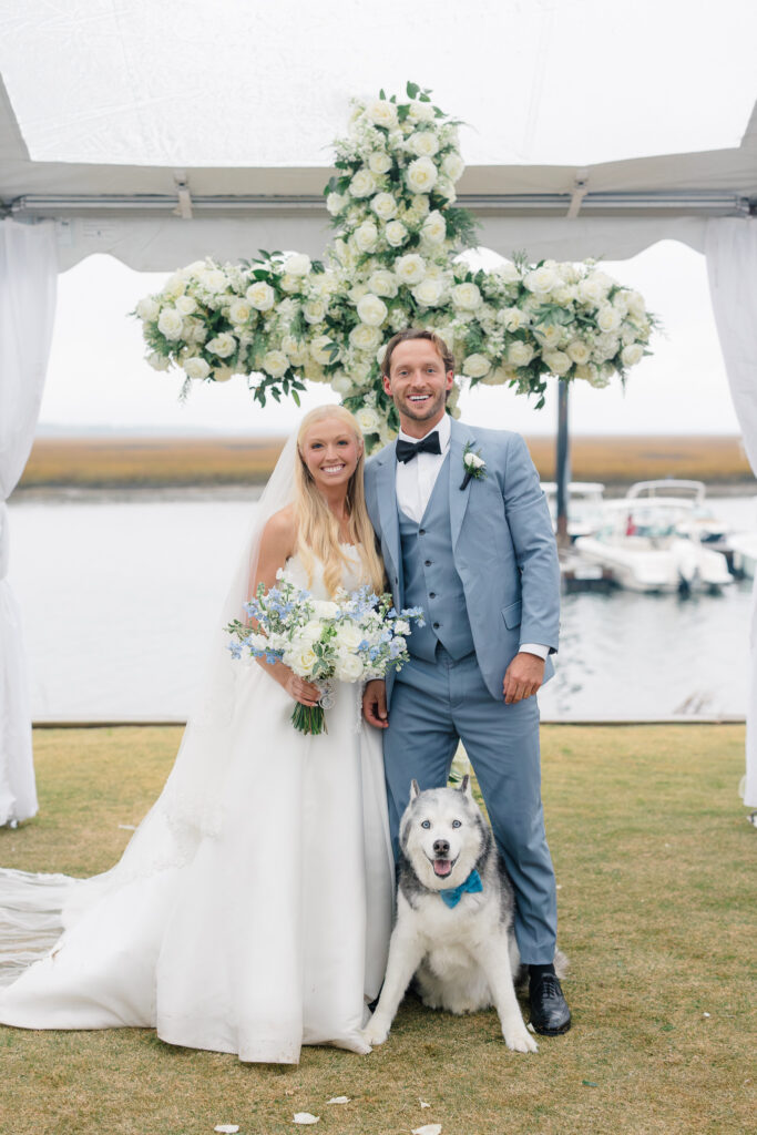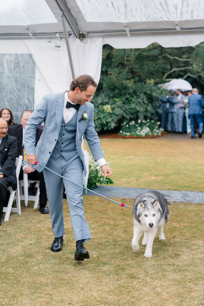 The ceremony took place overlooking the water, framed by an abundance of winter white florals. The rain was steady, but Katie & Cadan never let the weather dull a single moment. They said their vows surrounded by the people they love most—and their adorable pup, who proudly made an appearance.