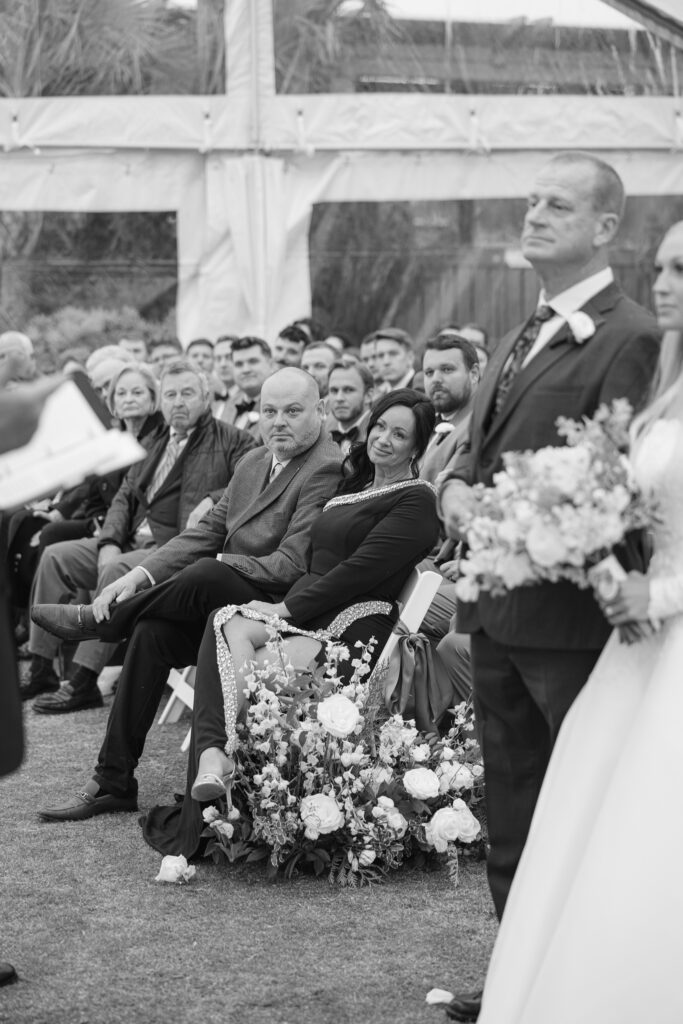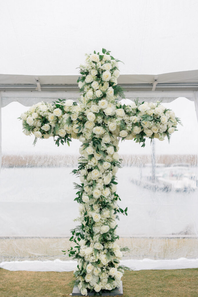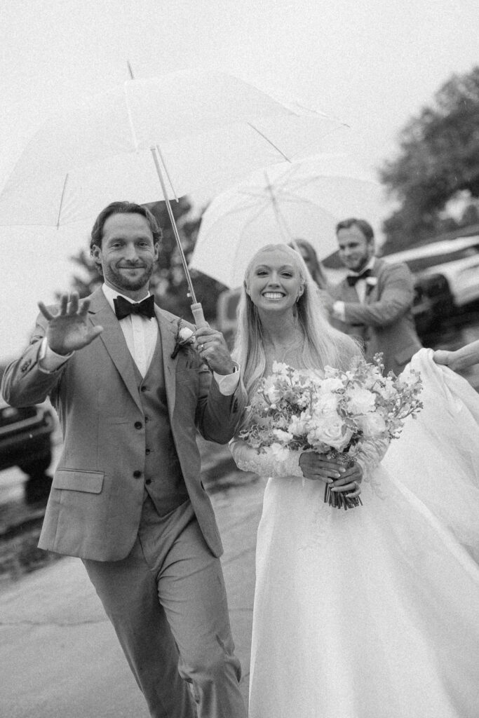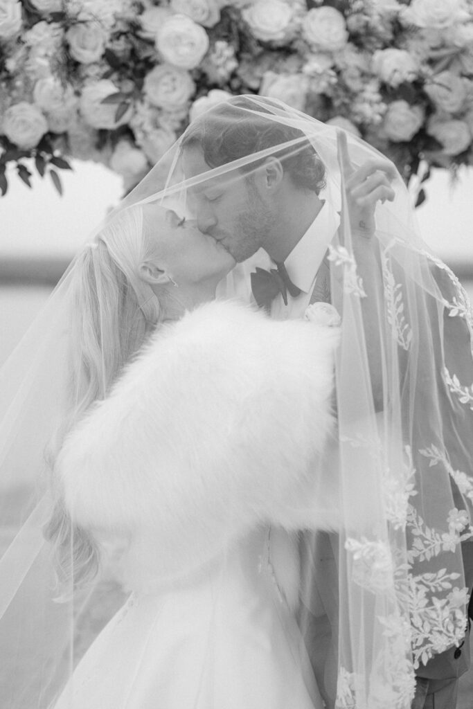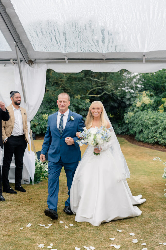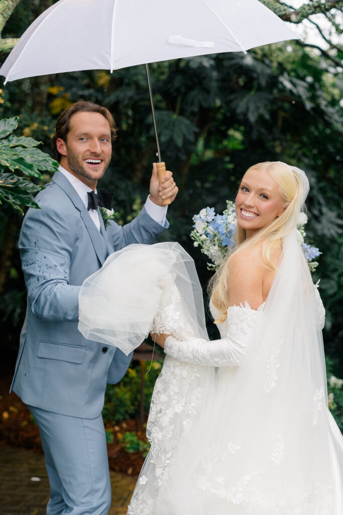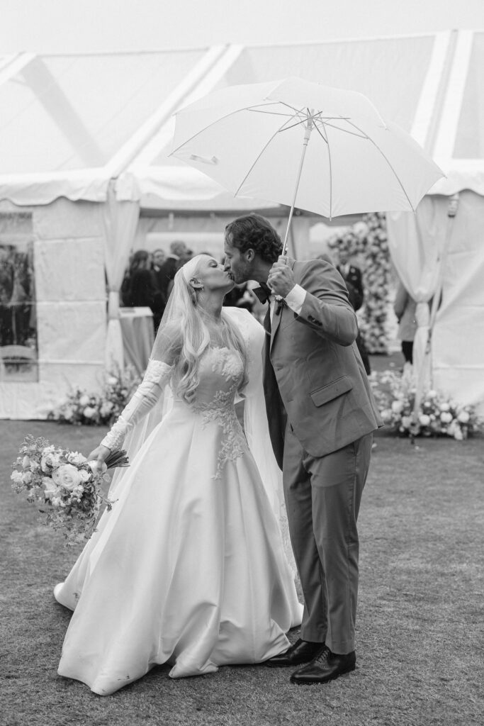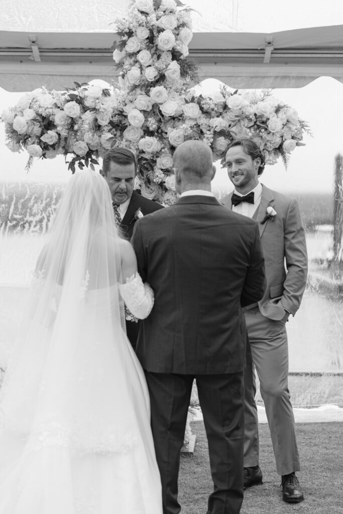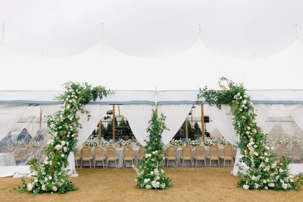 The ceremony took place overlooking the water, framed by an abundance of winter white florals. The rain was steady, but Katie & Cadan never let the weather dull a single moment. They said their vows surrounded by the people they love most—and their adorable pup, who proudly made an appearance.