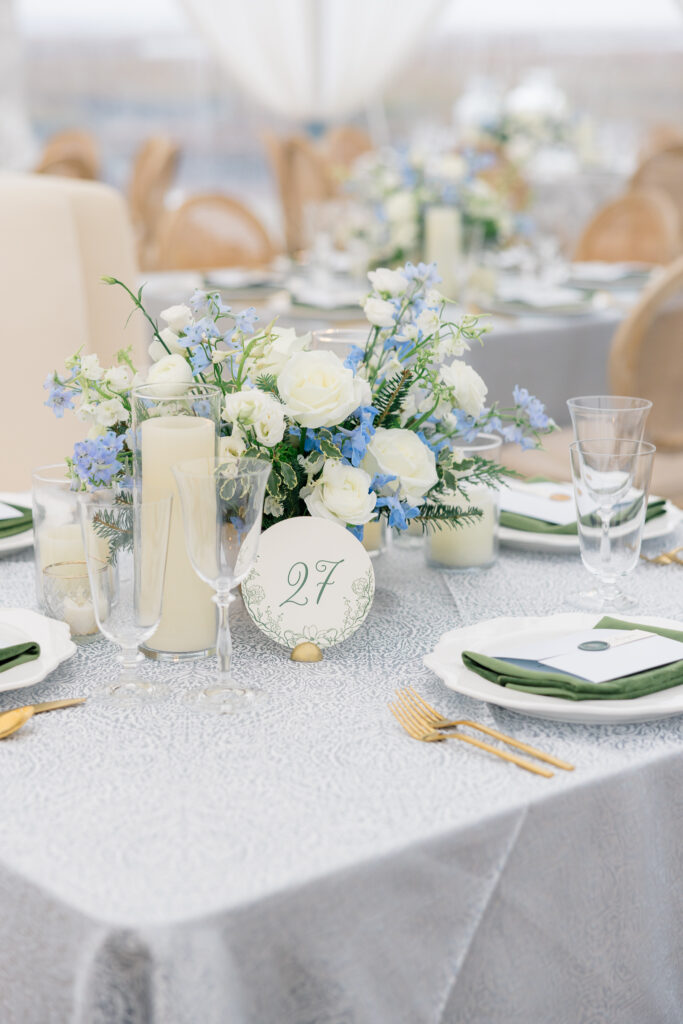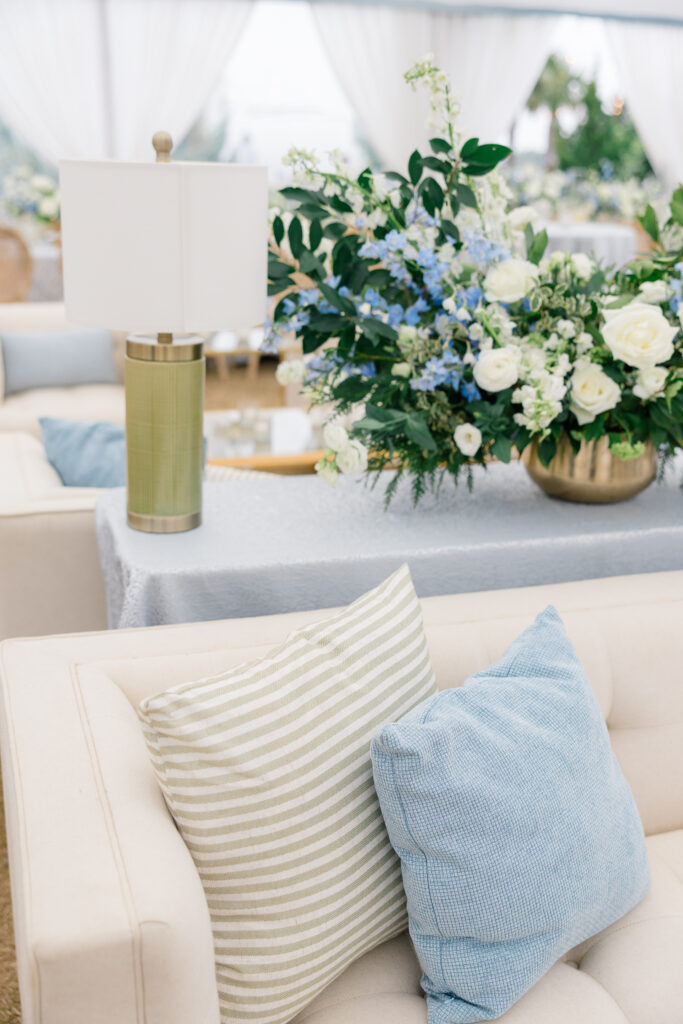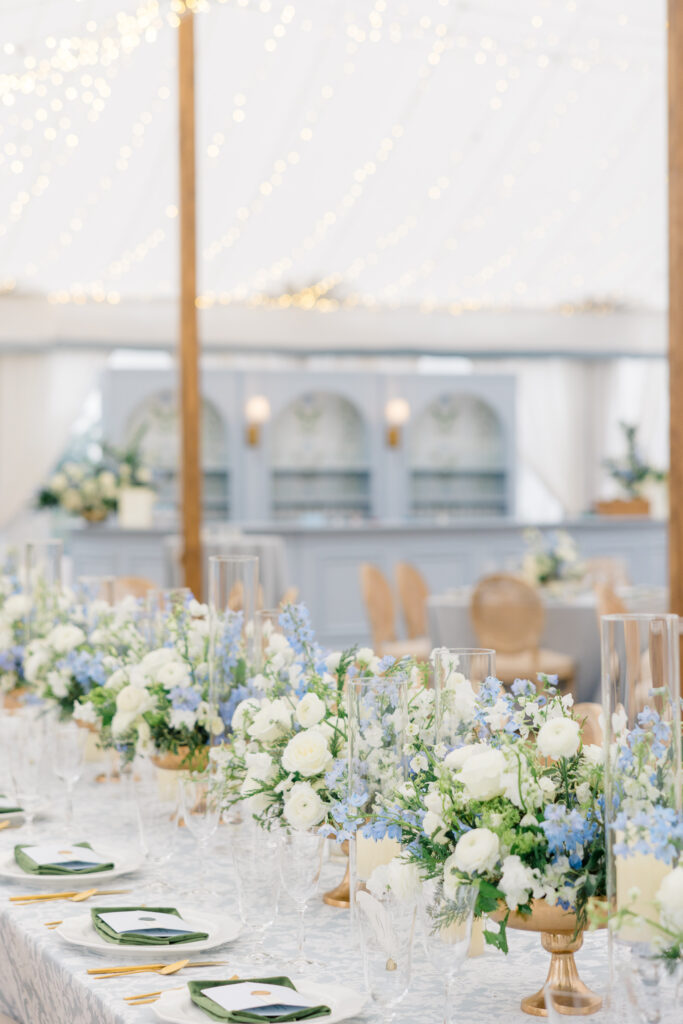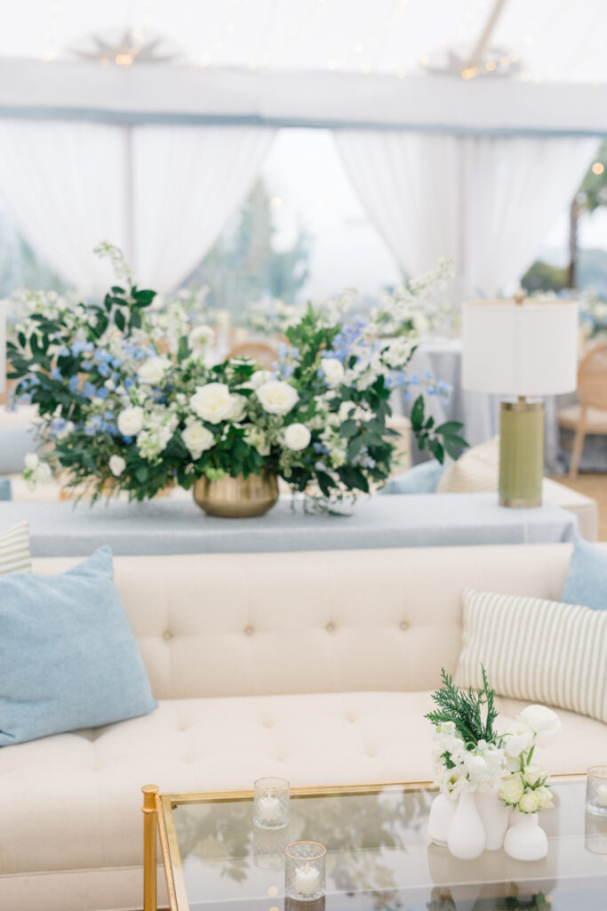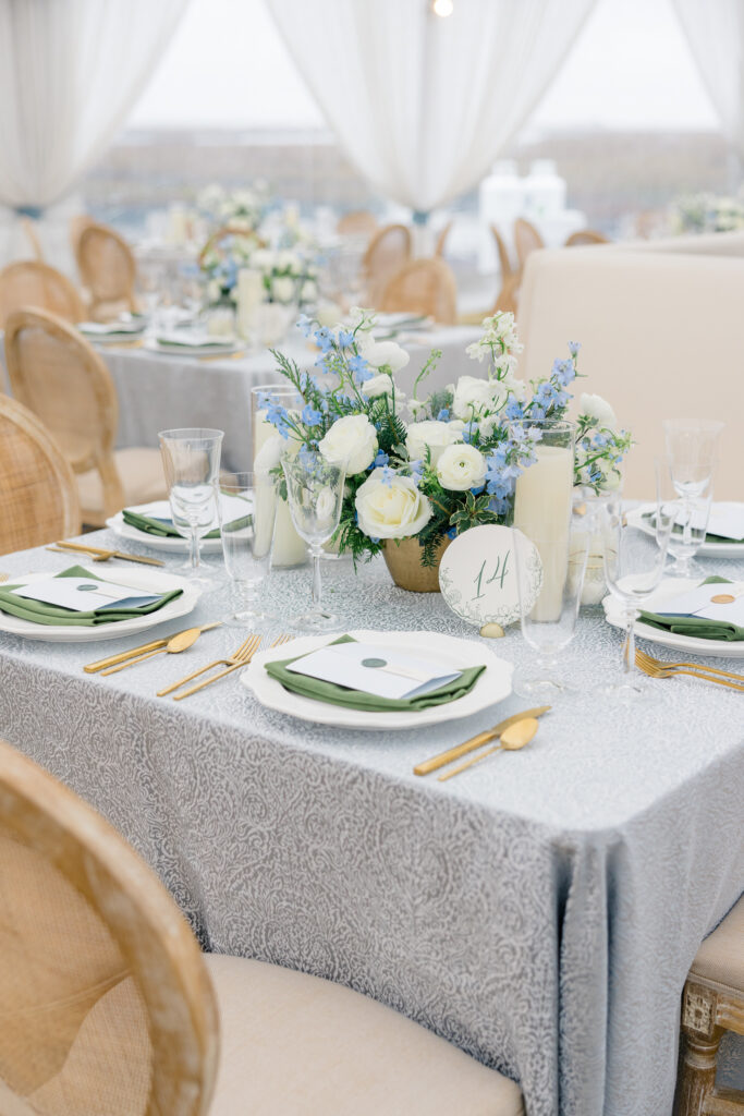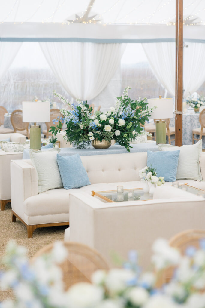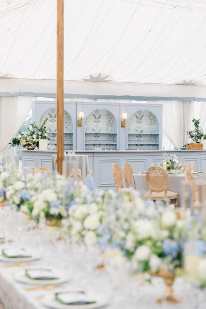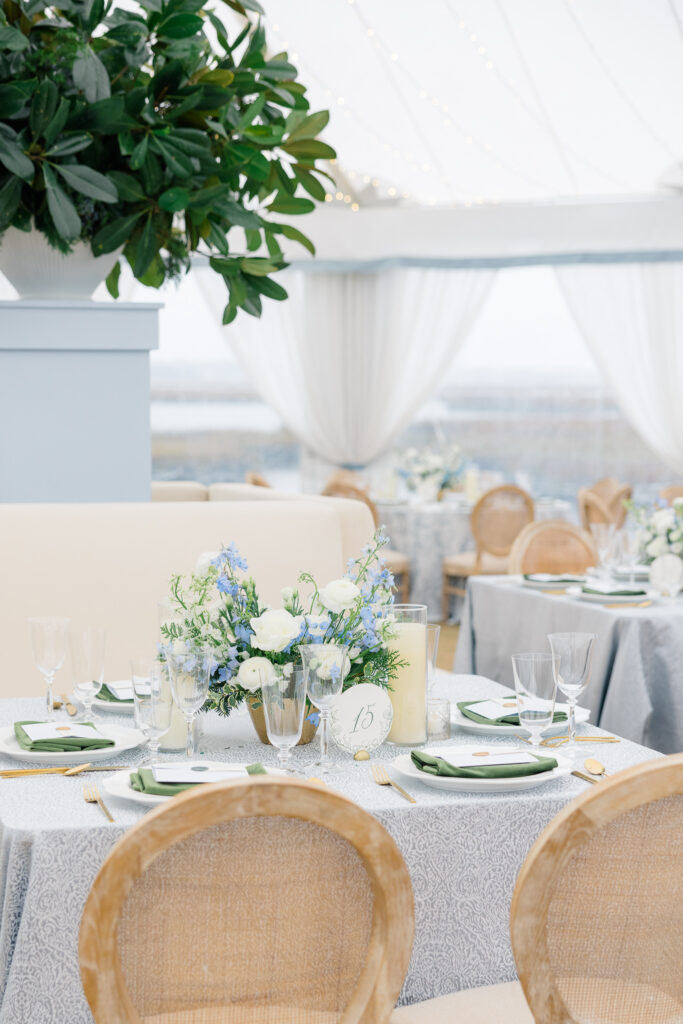 Salt Harbor Designs transformed the tented waterfront space into a serene winter haven. Soft blues, gentle greens, white florals, and candlelight filled the reception, creating the dreamiest December ambiance. The custom bar, blue patterned linens, lounge pockets, and lush floral arrangements layered texture and elegance without distracting from the natural waterfront setting.