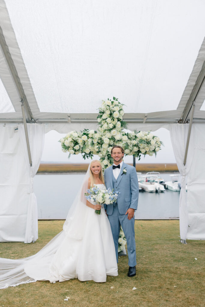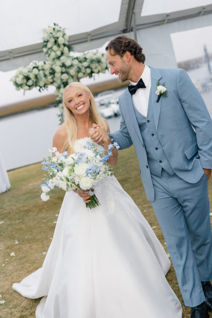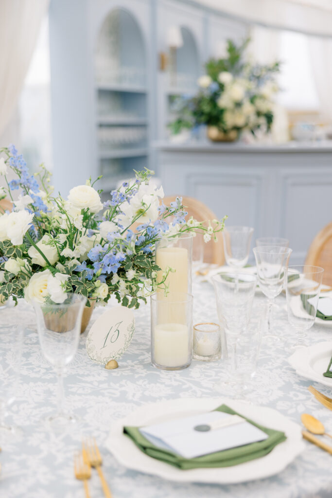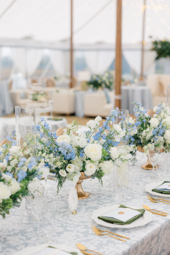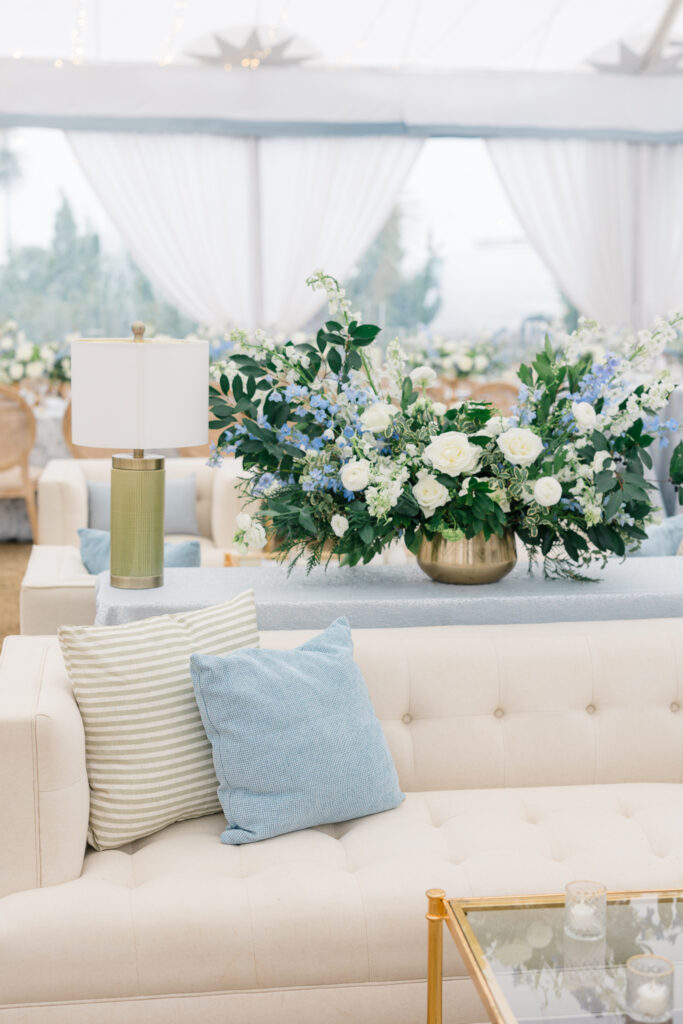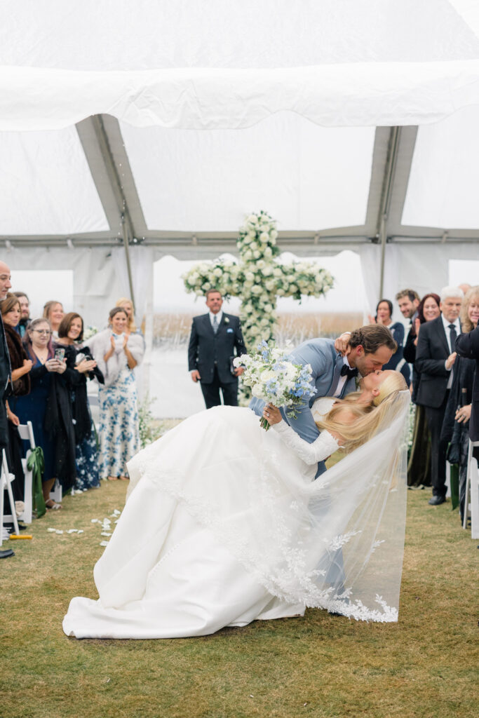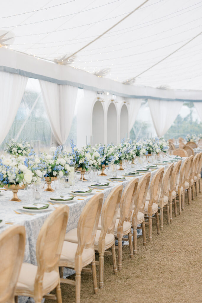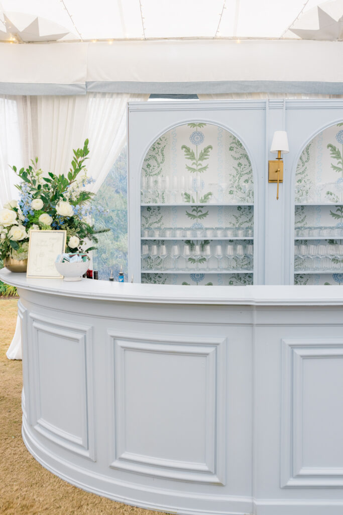 Salt Harbor Designs transformed the tented waterfront space into a serene winter haven. Soft blues, gentle greens, white florals, and candlelight filled the reception, creating the dreamiest December ambiance. The custom bar, blue patterned linens, lounge pockets, and lush floral arrangements layered texture and elegance without distracting from the natural waterfront setting.