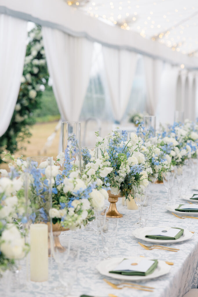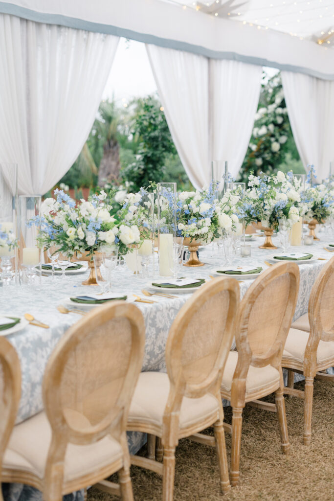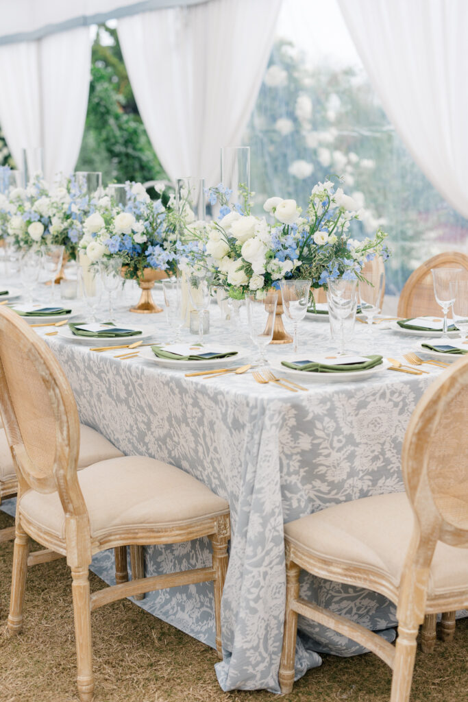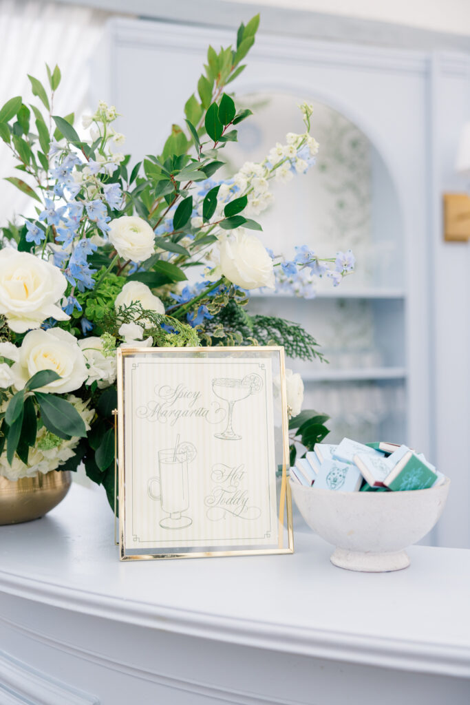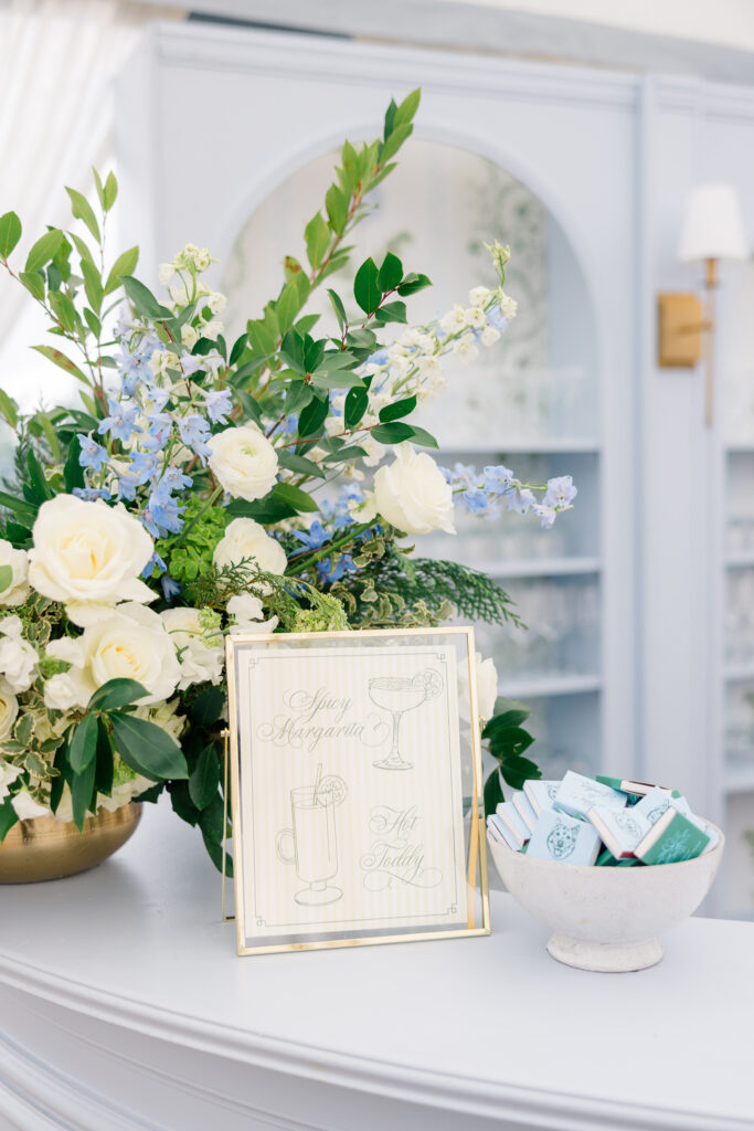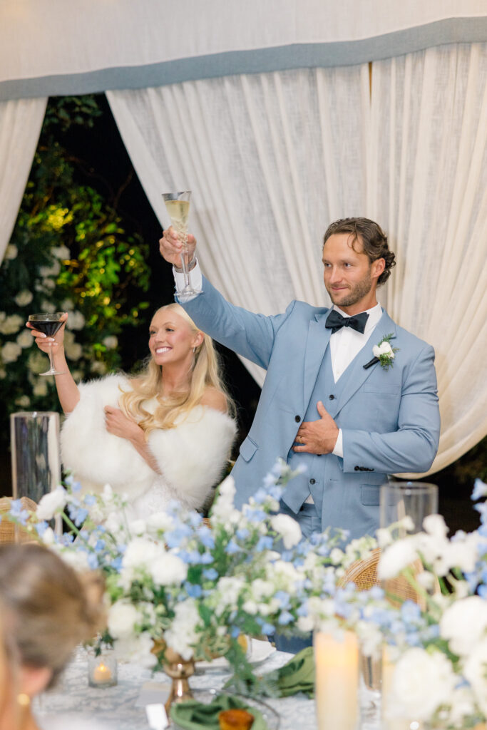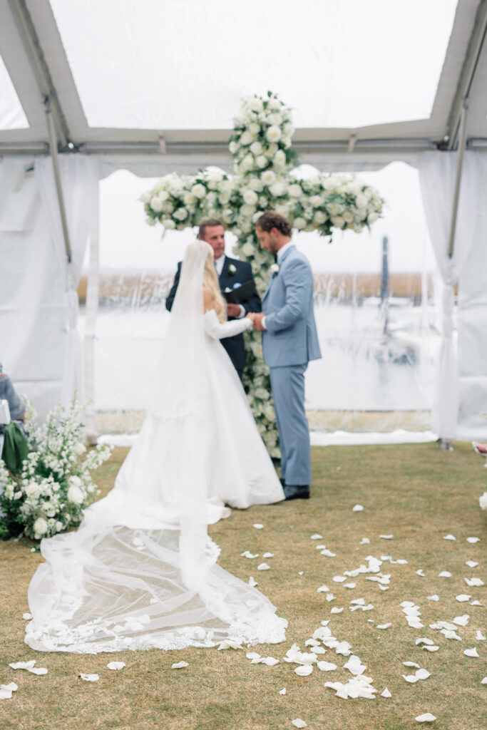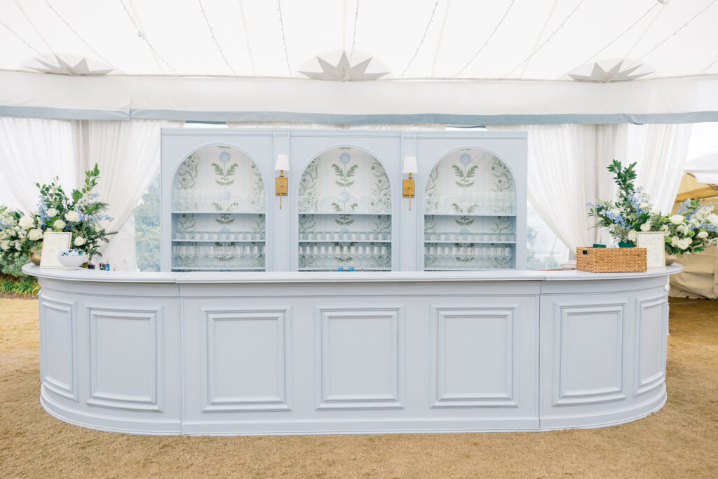 Salt Harbor Designs transformed the tented waterfront space into a serene winter haven. Soft blues, gentle greens, white florals, and candlelight filled the reception, creating the dreamiest December ambiance. The custom bar, blue patterned linens, lounge pockets, and lush floral arrangements layered texture and elegance without distracting from the natural waterfront setting.