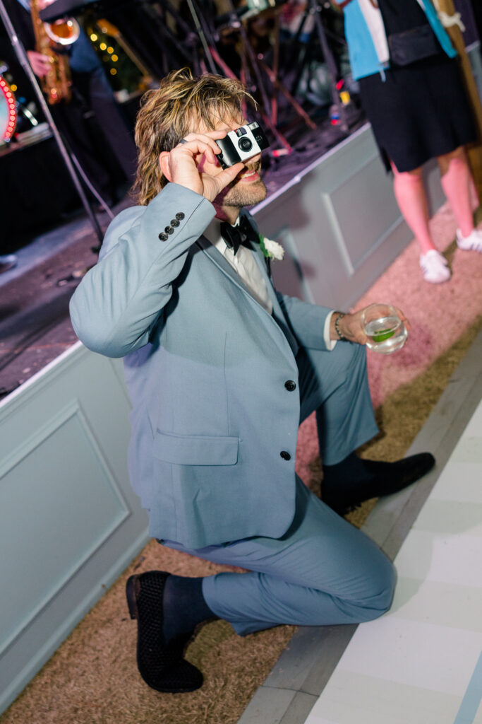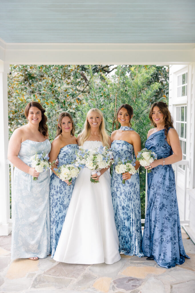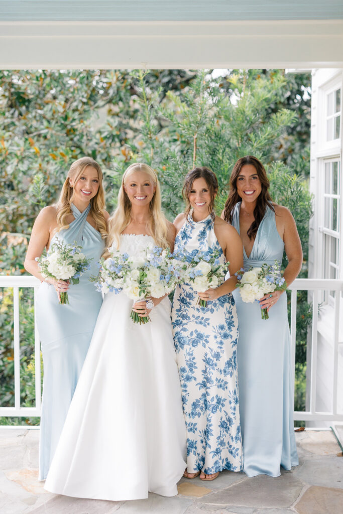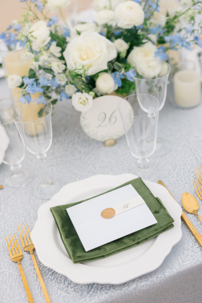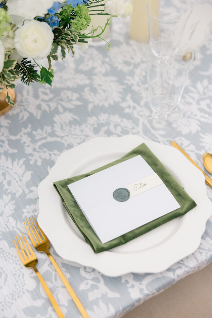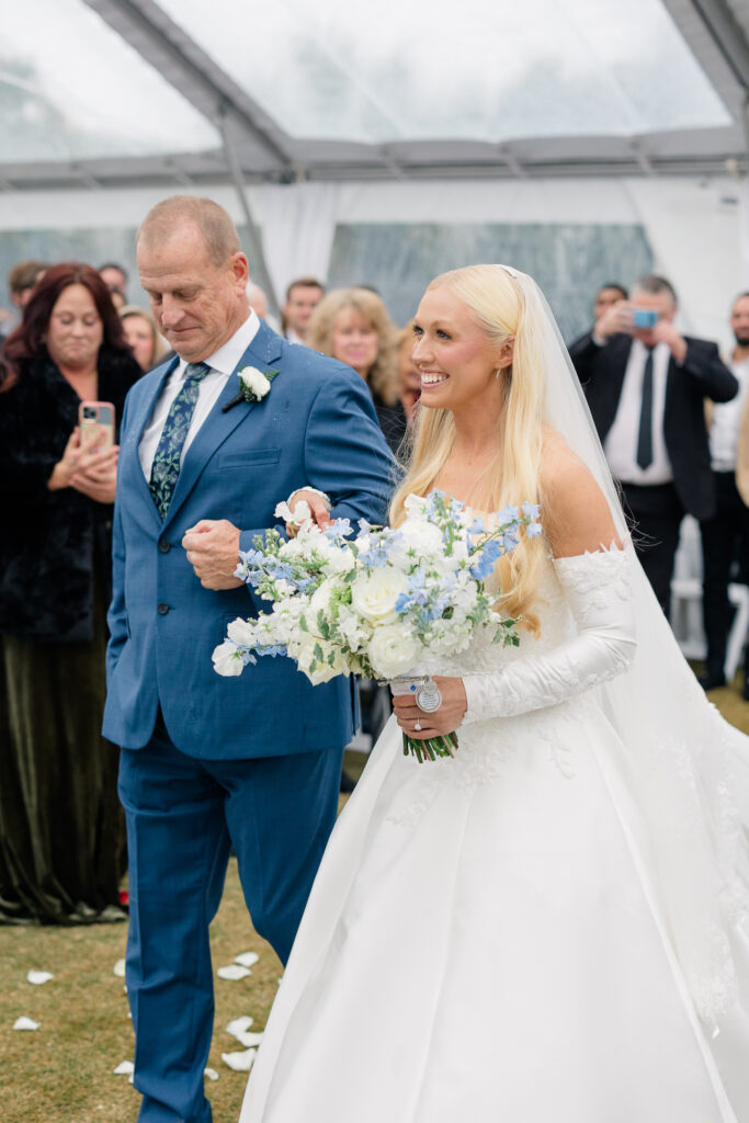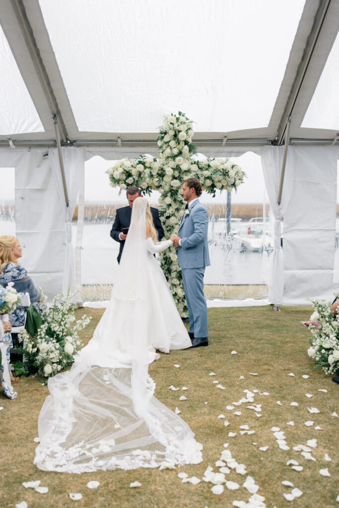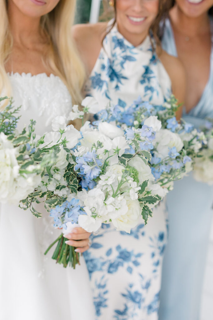 Salt Harbor Designs transformed the tented waterfront space into a serene winter haven. Soft blues, gentle greens, white florals, and candlelight filled the reception, creating the dreamiest December ambiance. The custom bar, blue patterned linens, lounge pockets, and lush floral arrangements layered texture and elegance without distracting from the natural waterfront setting.